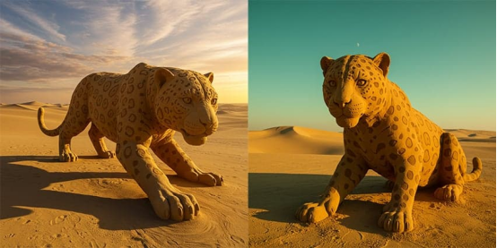 金色沙粒構成的捷豹在日落時分的沙漠景觀中潛行,戲劇性陰影,復雜細節,閃爍的沙粒質感,動態姿勢,溫暖色調,照片級渲染,銳利焦點,電影級燈光,高清畫質。
