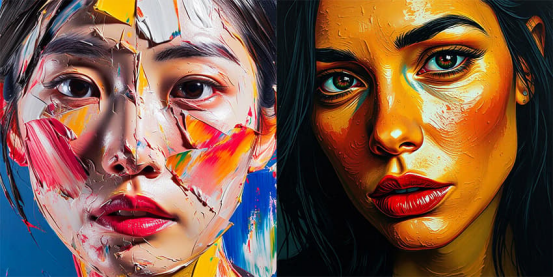 女性肖像,厚涂質感,采用調色刀堆疊的濃烈油彩。鮮艷色彩與大膽筆觸展現深度與情感。特寫鏡頭,強烈眼神,藝術感,粗獷紋理。