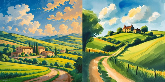 水粉繪制的田園詩般風光,展現起伏山丘、翠綠田野間的古樸農舍,清澈藍天與蓬松云朵,蜿蜒土路,沐浴在夏日午后的溫暖金色陽光中,營造寧靜懷舊的氛圍。