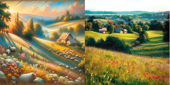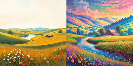 寧靜田園景色。起伏山丘與靜謐河流交匯于 pastel 天空下。盛開的野花田與遠處 rustic 谷倉。通過海綿與抹布繪畫技法呈現印象派質感,捕捉柔和光影。溫暖色調, reminiscent 金色時刻。
