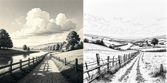 寧靜田園的鉛筆素描。起伏山丘與靜謐河流在散落云朵的廣闊天空下相遇。風化的木柵欄沿土路延伸至 lush 樹叢中的老舊農舍。柔和陰影與細膩紋理傳遞出 peaceful 孤立與懷舊感。