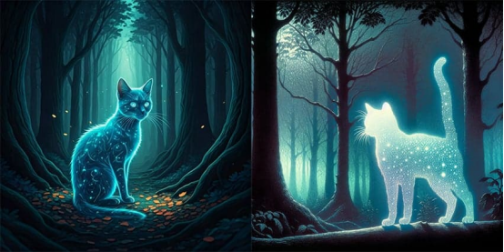 一只生物熒光貓的剪影,置身寧靜霧靄森林。 Cerulean、薰衣草和翡翠的冷色調營造 ethereal 氛圍。柔和 diffuse 光線透過古樹,照亮貓咪的 radiant 輪廓。微風拂動落葉, enhance 場景的神秘感。