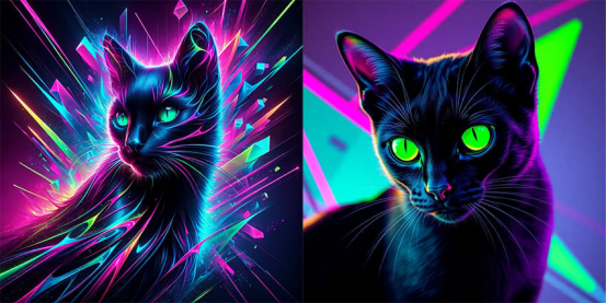 一只 sleek 黑貓,綠色 piercing 眼睛,沐浴在 vibrant 霓虹色中:電光藍、 hot 粉和 acid 綠。賽博朋克美學, dynamic 姿勢,抽象背景帶幾何形狀。高對比度, dramatic 燈光, futuristic,數字藝術。