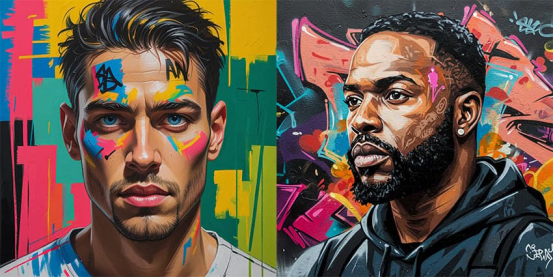 引人注目的男性肖像,面部裝飾 vibrant 城市涂鴉藝術。 Bold 色彩, dynamic 線條與 intricate 圖案融合街頭藝術與古典肖像。 Raw 城市能量與 refined 藝術技法的融合, capture 街頭 essence。