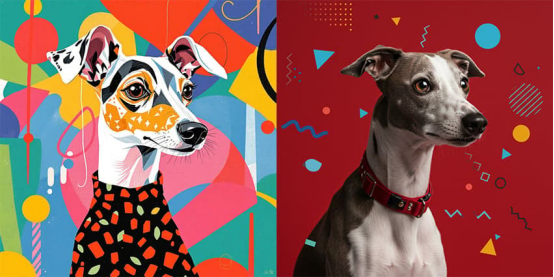 靈緹犬肖像,受孟菲斯設計學派影響,幾何圖案, vibrant 原色, playful 抽象背景,1980年代美學, bold 圖形元素, dynamic 構圖,高對比度, whimsical 活力氛圍。