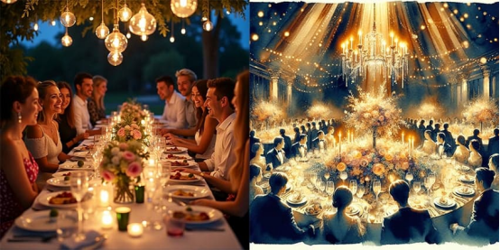 圍繞 festive 裝飾的婚宴桌,沐浴溫暖金色燈光。優雅花卉 centerpieces, sparkling 玻璃器皿與美味佳肴點綴餐桌。 Capture 他們臉上洋溢的愛意、歡笑與幸福,共同慶祝新人。聚焦于創造 heartwarming 而難忘的場景,充滿真摯情感。