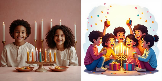 一群孩子歡聚在明亮燭臺旁,慶祝光明節。 Festive 氛圍, colorful 裝飾,傳統猶太符號與美味節日美食。溫暖 inviting 燈光, capture 團結精神與文化傳統。