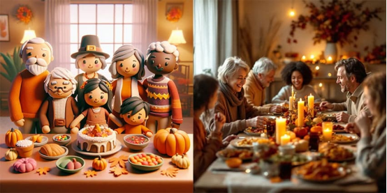 溫馨感恩節晚餐場景。多代同堂的家庭圍坐在 festive 裝飾的餐桌旁,桌上擺滿傳統菜肴。柔和 inviting 燈光,營造 cozy 歡樂氛圍。聚焦于家庭成員間感恩與 connection 的表情。 Capture 秋季色彩——橙、棕與紅——在裝飾與食物中。