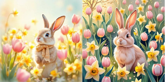 柔美色調的復活節賀卡, whimsical 兔子置身盛開的郁金香與水仙花田,沐浴柔和金色陽光。 Delicate 水彩質感,精致花卉圖案, serene 歡樂氛圍 evoke 春日 renewal 與 celebration 的 essence。