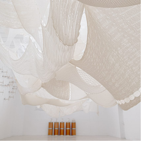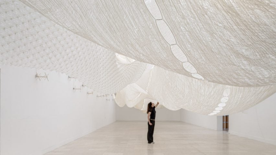 由手工與機器人共同編織的羊毛織物從天花懸垂而下,在太陽能電機驅(qū)動下逐漸解構。至雙年展閉幕時,裝置將完全回歸125個毛線球的初始狀態(tài)。該作品探索建筑循環(huán)性及自然與人工智能的邊界關系。