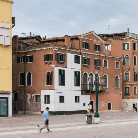 建筑師Keiti Lige、Elina Liiva和Helena M?nna用純白隔熱板包裹威尼斯濱水區(qū)一棟老建筑外墻。這些纖維水泥覆面板復刻了愛沙尼亞蘇聯(lián)時期住宅區(qū)的保溫改造方案,團隊認為這種措施只是"權宜之計"。通過這種鮮明的材料對比,他們希望引發(fā)關于如何更人文地實現(xiàn)歐洲能源目標的討論。