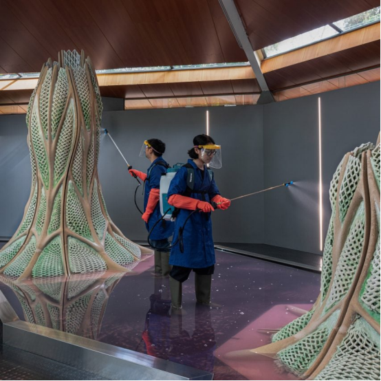 ETH Zurich研究員Andrea Shin Ling領銜呈現(xiàn)的異形結構表面覆蓋固碳藍藻,3D打印的晶格架構配合水景裝置,展示未來生物建造的可能性。