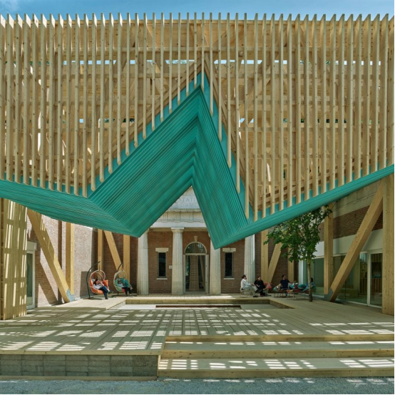 在新古典主義建筑前搭建鋸齒形重木結構?canopy,以門廊這一美國建筑原型探討公共空間的包容性。