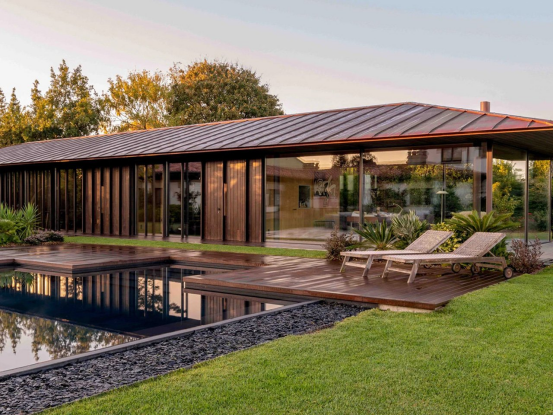 Baldó Arquitectura在西班牙北部的五大亭以日本“五大”元素(火、地、水、風、空)為靈感。懸挑的竹制屋頂與透明立面將田園風光框入其中,竹條按斐波那契序列排列,既呼應傳統榻榻米房間,又調節了隱私與光線。