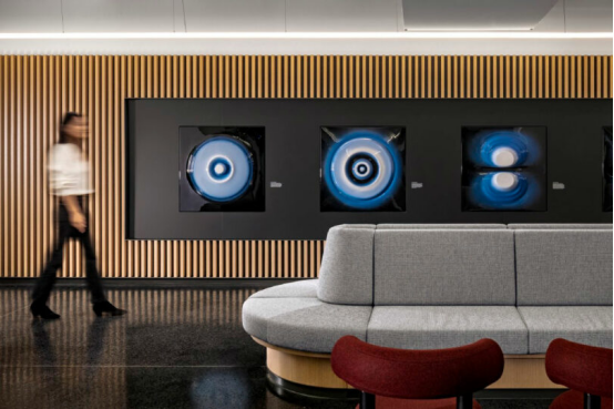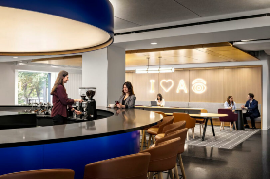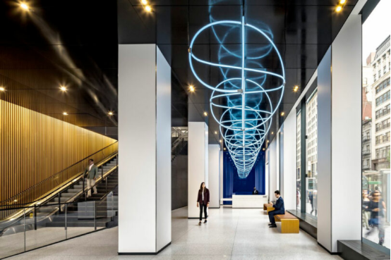 大堂內40英尺(約12米)長的"量子波"雕塑成為視覺焦點,隱喻IBM在前沿科技領域的探索。二層環形"藍色酒吧"(Blue Bar)兼具咖啡廳與晚間社交功能,坐擁麥迪遜廣場公園全景。創新工作室(Innovation Studio)則配備智能會議系統,供客戶與員工實時共創。