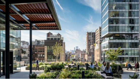 作為"藍色巨人"(Big Blue),IBM的企業色通過聲學毛氈墻面、樓梯鑲邊等細節貫穿空間。天然木材與石材呼應人文溫度,而拋光金屬、反射面與芯片紋理的裝飾則暗示科技未來。最令人驚嘆的是與RGR Landscape合作打造的2.5萬平方英尺(約2322平方米)屋頂花園——這座紐約最大商業辦公露臺種植40種植物(半數為紐約本土物種),每個座位配備電源與高速Wi-Fi,既可舉辦大型活動,也設有私密休憩角。