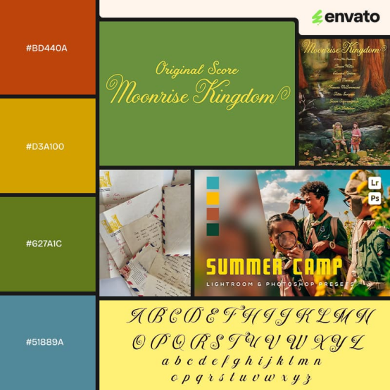 芥末黃與草綠構建夏令營明快基調,雨季來臨時轉為灰藍,隱喻童年純真的消逝。對稱構圖在成人世界的混亂中創造視覺秩序。