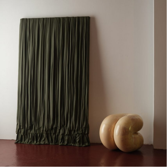 藝術家Monica Curiel則在Love House畫廊新空間的"家庭展"中,以石膏打造出垂墜綠綢緞裝飾板,流蘇與褶皺細節挑戰著觀眾的感知邊界。