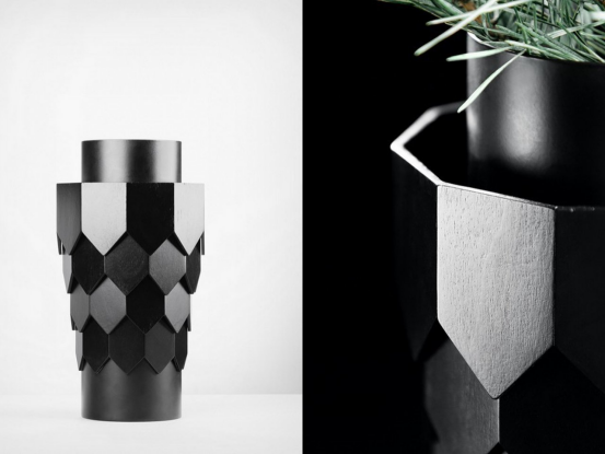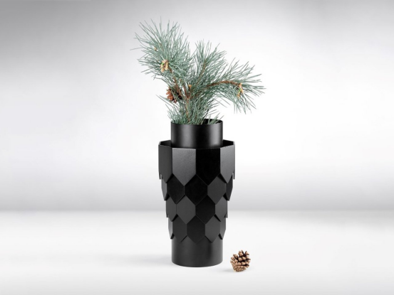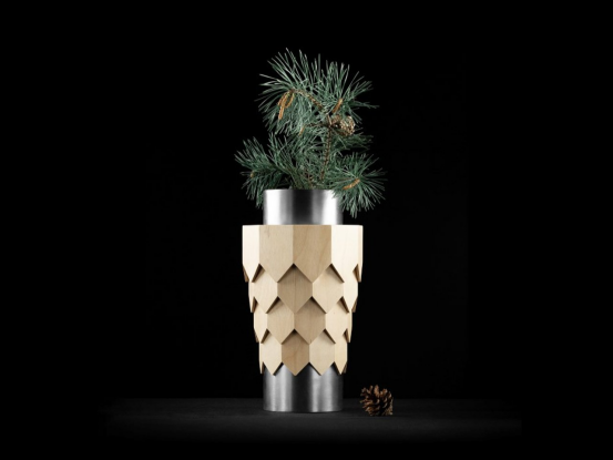 受松果結構啟發的Gont花瓶,以層壓膠合板外殼呈現靜謐的復雜性。其雕塑感輪廓含蓄而精致,內嵌金屬筒實用且優雅,適合擺放小型綠植。在光線充足處,幾何切面會捕捉動態光影,投射出建筑般的鮮明陰影。