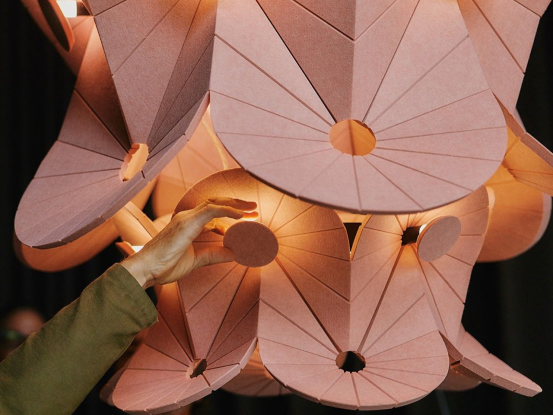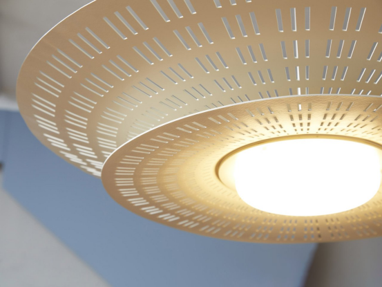 人本照明通過模擬自然光與調控藍光影響晝夜節律。瑞士Atelier O?工作室與Impact Acoustic合作的Olo?d聲學燈,用回收PET瓶制成的Archisonic毛氈,通過立體剪裁兼具吸音與照明功能。