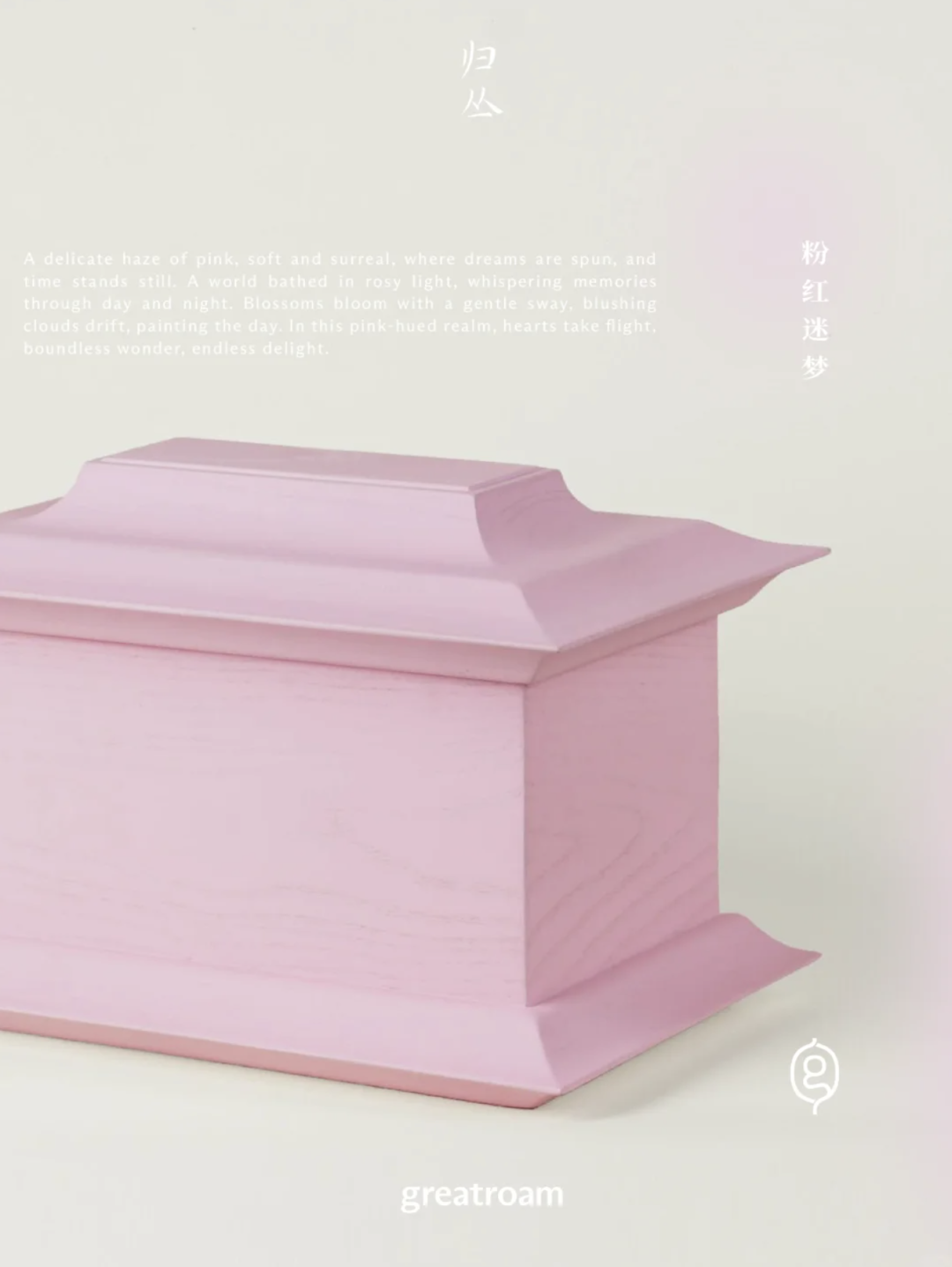 粉色結(jié)合木材細(xì)膩?zhàn)匀坏募y理,讓生命最后的美好永駐在這個(gè)容器里。