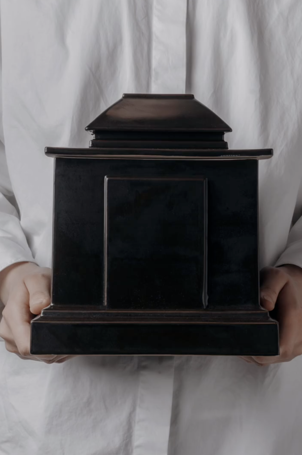 這款靈盒的造型靈感來自于古代的樓閣,如一座木質(zhì)亭臺,莊嚴(yán)地容納骨灰。