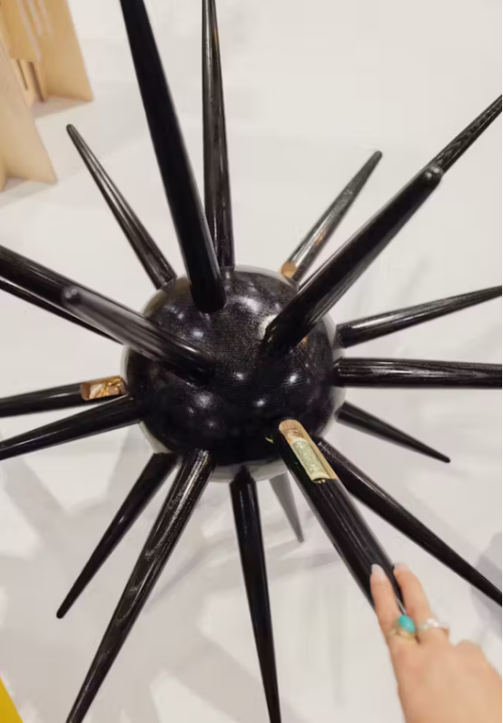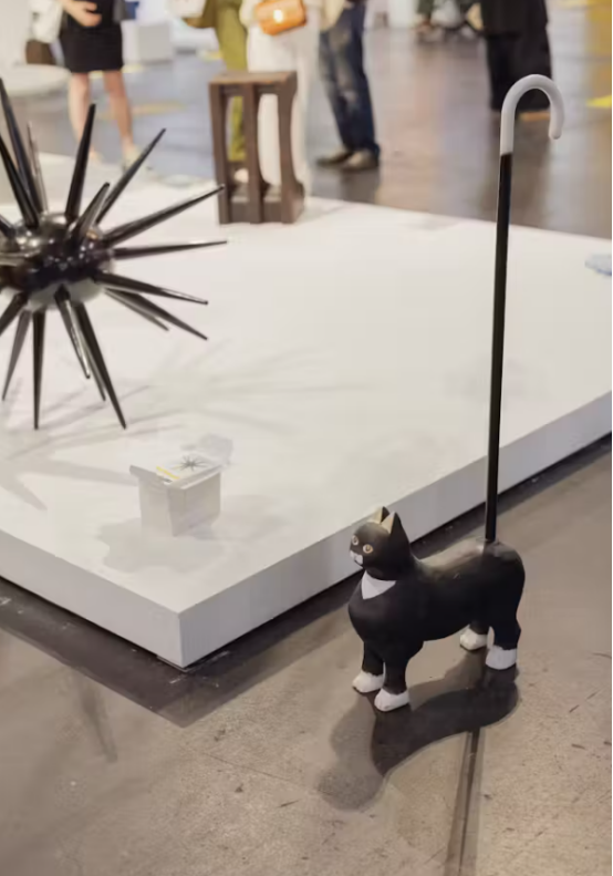 去年就備受矚目的設計師今年再出奇招:左側"海膽"珠寶盒的三根尖刺可拔出藏匿私人物品;右側楊木雕刻的貓咪擺件,竟以亞馬遜手杖為尾,重量足以防身。