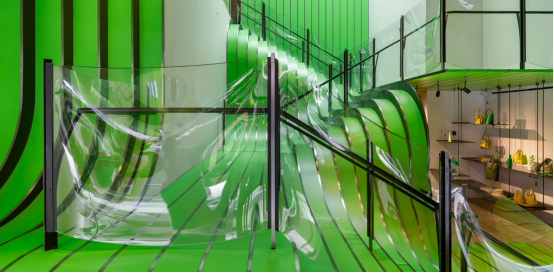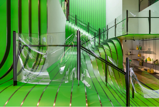 新設(shè)計(jì)保留標(biāo)志性緞帶樓梯,現(xiàn)以能量綠吸引訪客上行