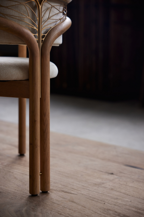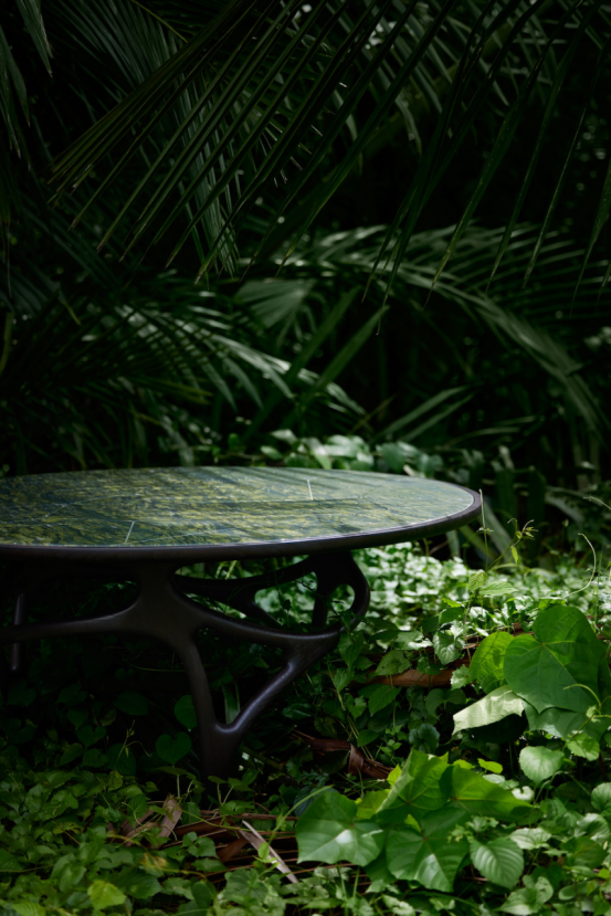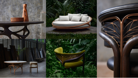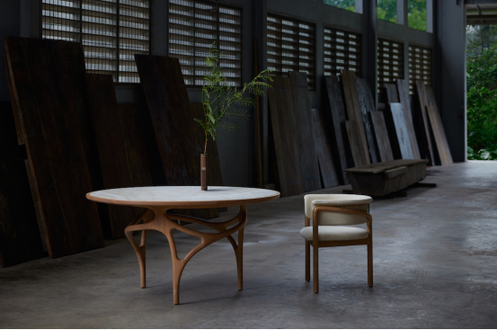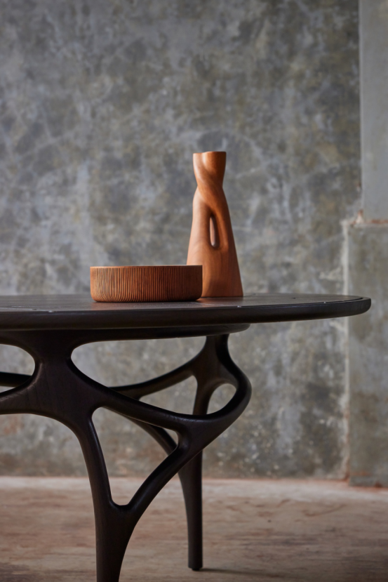 核心單品包括Cena餐桌——其底座靈感來自盤繞的樹根,桌面則采用長頸鹿斑紋與蜂巢的Voronoi圖案設計,提供天然橡木或深色柚木版本,可選米白/綠色石材臺面。
