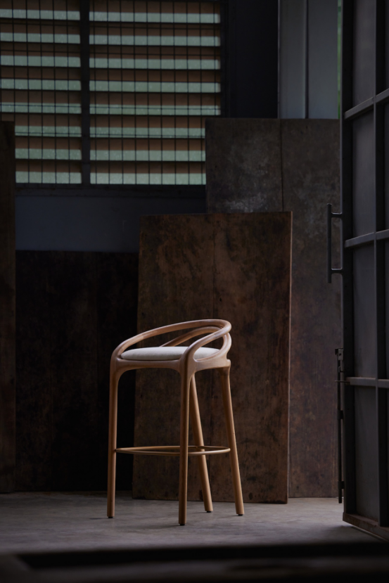 Aleta吧凳(意為"小翅膀")仿照蜻蜓翅膀形態,室內款可選黃銅、天鵝絨或皮革材質,戶外款采用柚木與耐用紡織面料。
