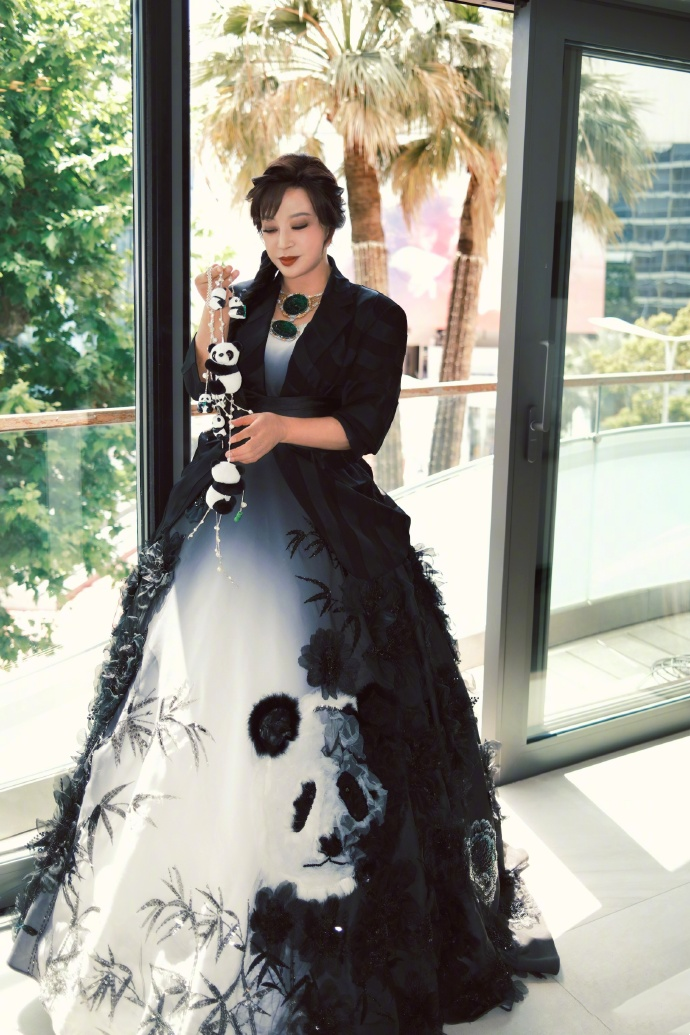 74歲的劉曉慶將牡丹、竹子、熊貓、水墨畫等中國元素穿上身,盡顯新中式典雅。