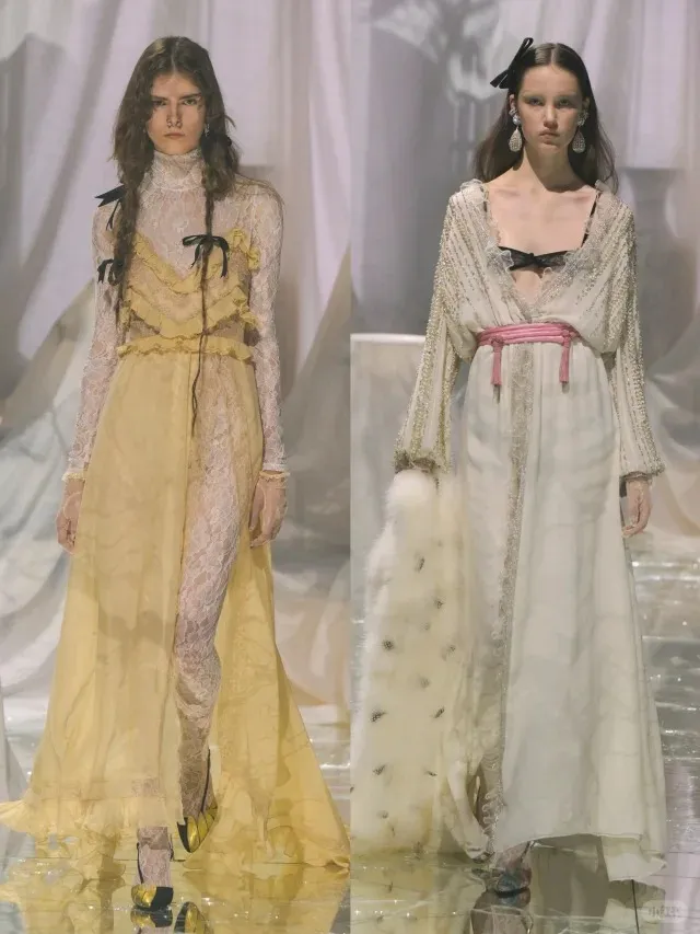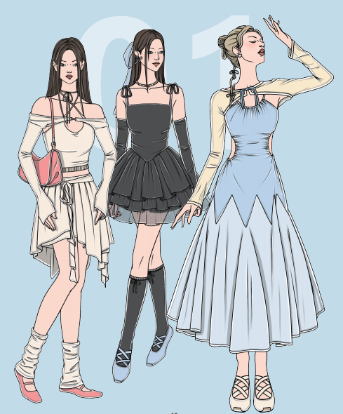 芭蕾風的代表性元素有綁帶款大領口多層次蓬蓬裙、不規則連衣裙、足尖鞋、堆堆襪、蝴蝶絲帶等,顏色多為溫柔靜謐的淺藍、鵝黃、淺粉,營造甜美、優雅的氛圍感。