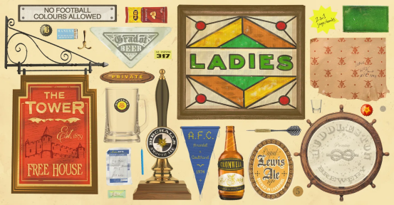 首先坦白:我不喝精釀啤酒,厭惡蘋果酒,對世濤、波特等渾濁暖飲也敬謝不敏。我的口味很簡單——只愛傳統英式酒吧里的一品脫拉格。酒吧貫穿我的成年生活:初到陌生城市時結識朋友,觀看現場音樂與體育賽事。它們不僅是飲酒場所,更是社交生活的基石。那些手繪招牌、復古地毯、啤酒杯墊和零食包裝,構成了我記憶中的幸福拼圖。無論是貝克武器館的臺球桌、冠軍酒吧的彩繪玻璃,還是莎士比亞頭像酒館的皇家油畫、特拉法加戰役酒館的招牌,每個細節都意義非凡。
