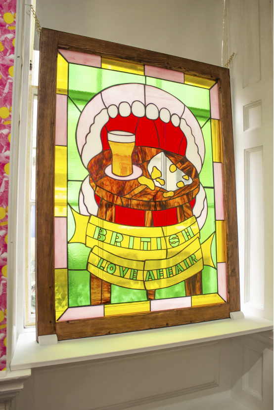步入傳統酒吧如同開啟盲盒:可能是《美國狼人在倫敦》里"屠宰羔羊"般的陰森,也可能是原木吧臺、壁爐與手刻字體的溫馨。米莉·阿伯羅在巴斯44AD藝術空間打造的《咸脆酒館》裝置,通過新藝術風格陶瓷磚、彩繪玻璃等元素,重構了這種體驗。"這個虛構酒館致敬了東迪恩的'星與吊襪帶'與奇切斯特的'自由狐貍'——那些燭光搖曳的餐桌、古德伍德賽馬場的老照片,承載著我和親友的珍貴回憶。"