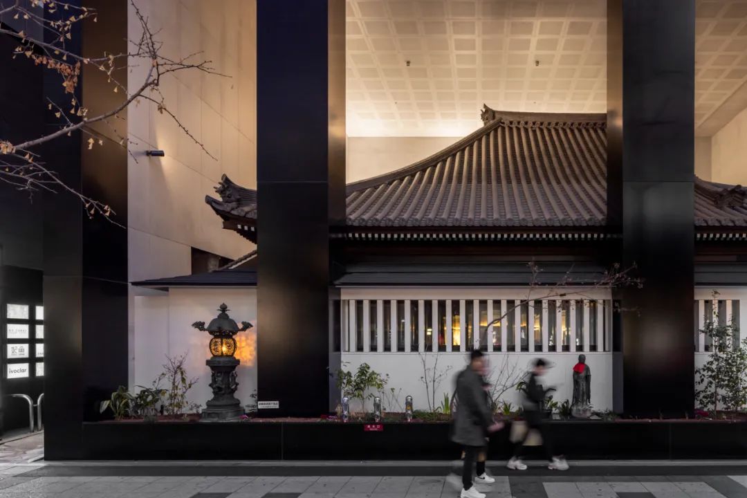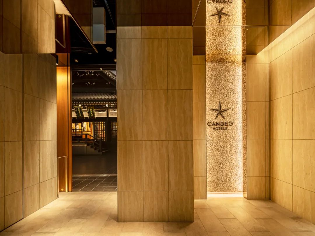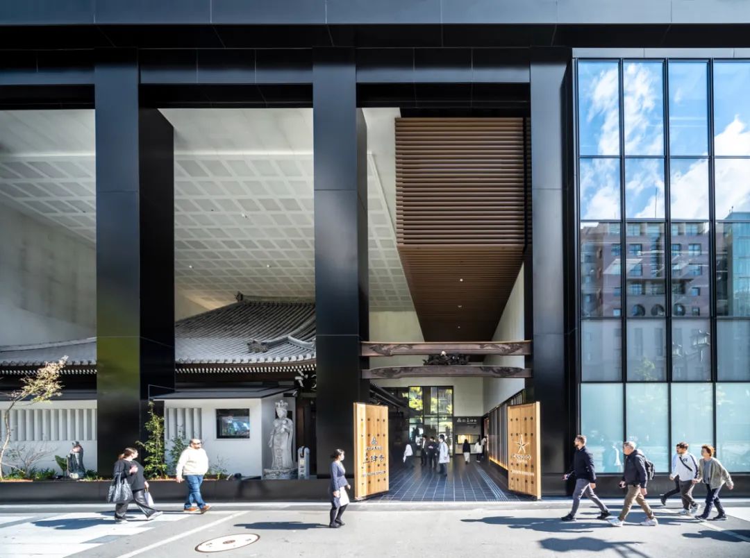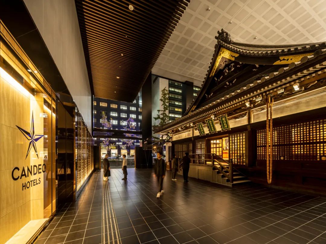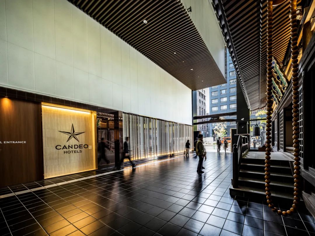 酒店區域由 Candeo Hotels 運營,設有180間客房,分布于中高層。底層商業部分與周邊街區連通,采用開放式街區布局。項目通過與寺方簽署定期土地租賃合同,在保障宗教設施繼續使用的同時,實現建筑物對土地的集約利用。