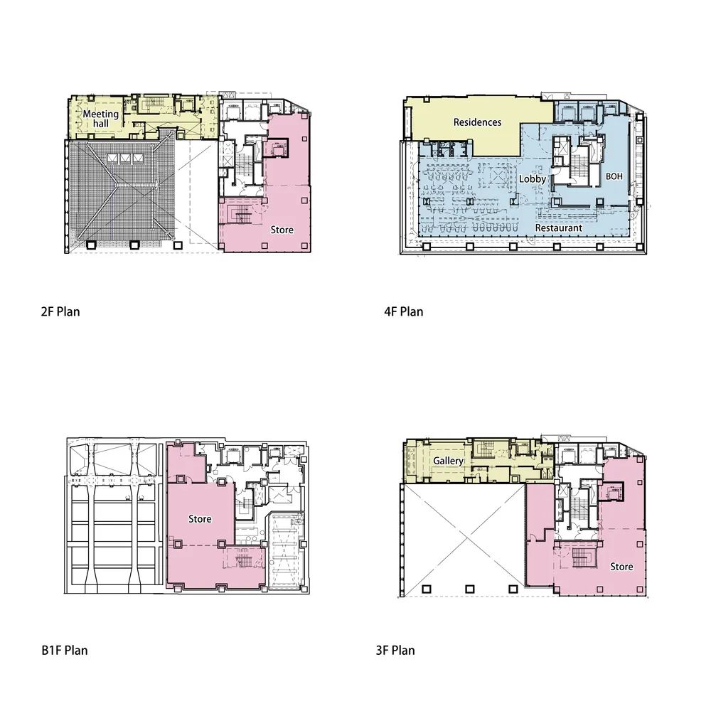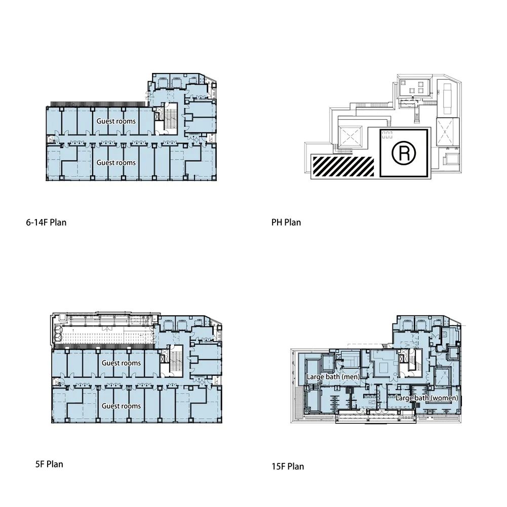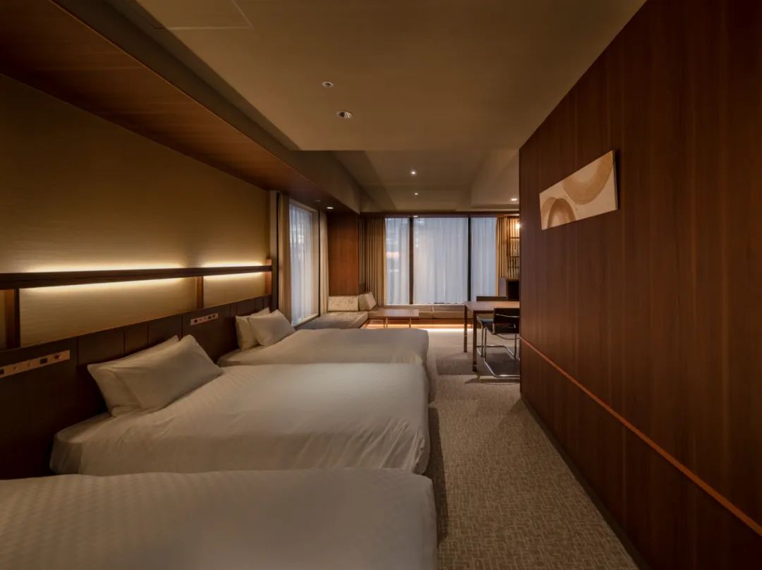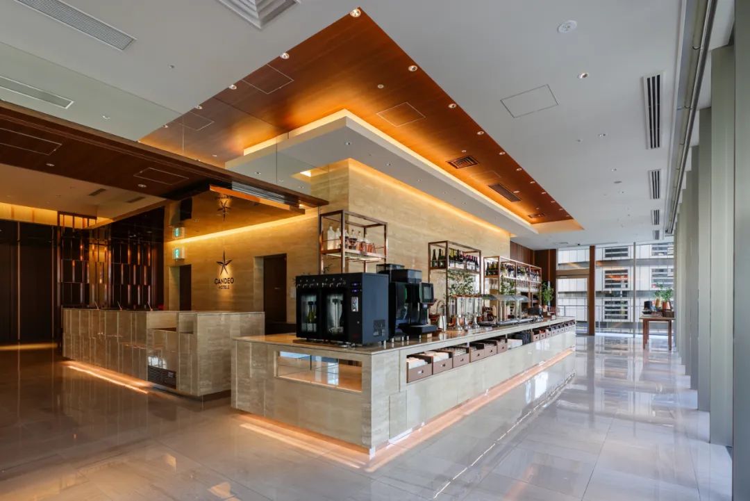 酒店區域由 Candeo Hotels 運營,設有180間客房,分布于中高層。底層商業部分與周邊街區連通,采用開放式街區布局。項目通過與寺方簽署定期土地租賃合同,在保障宗教設施繼續使用的同時,實現建筑物對土地的集約利用。