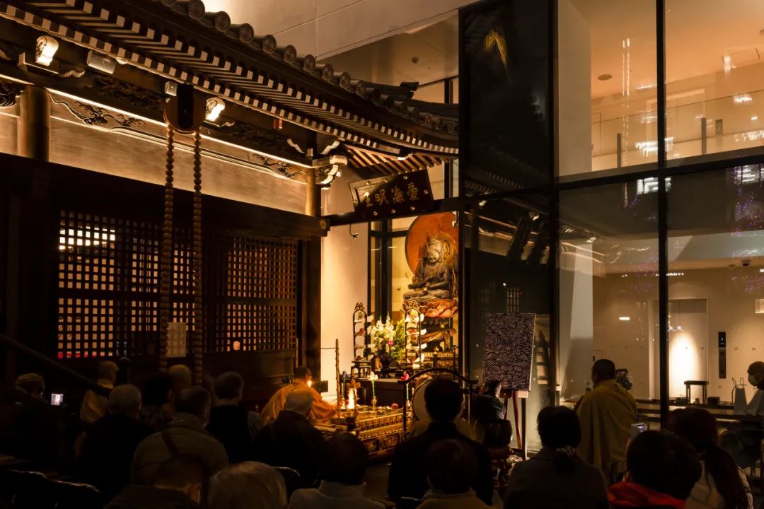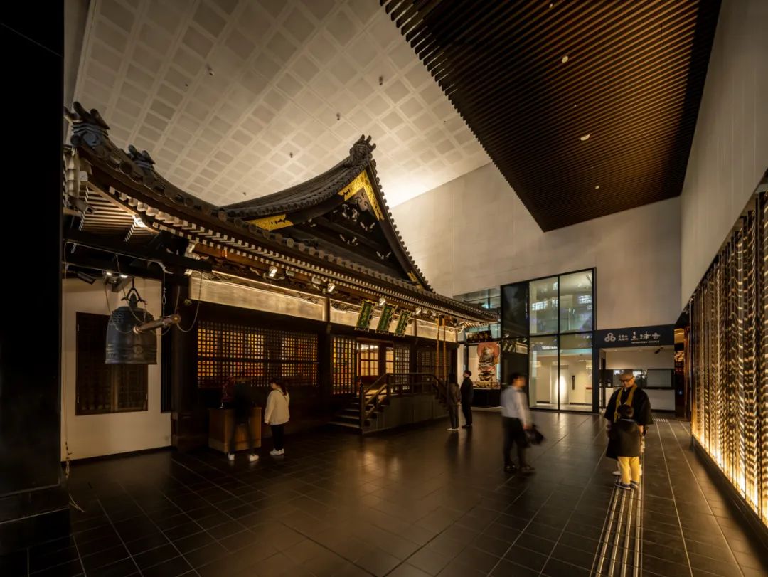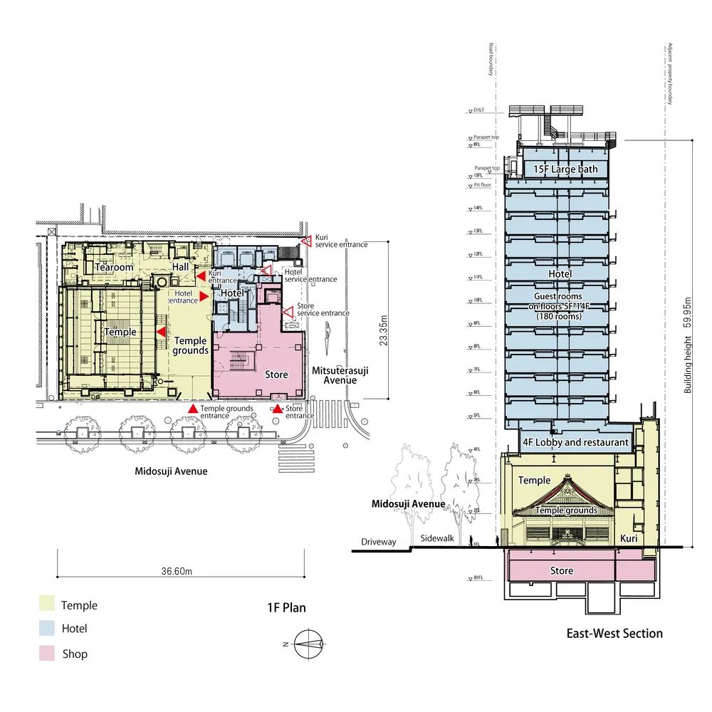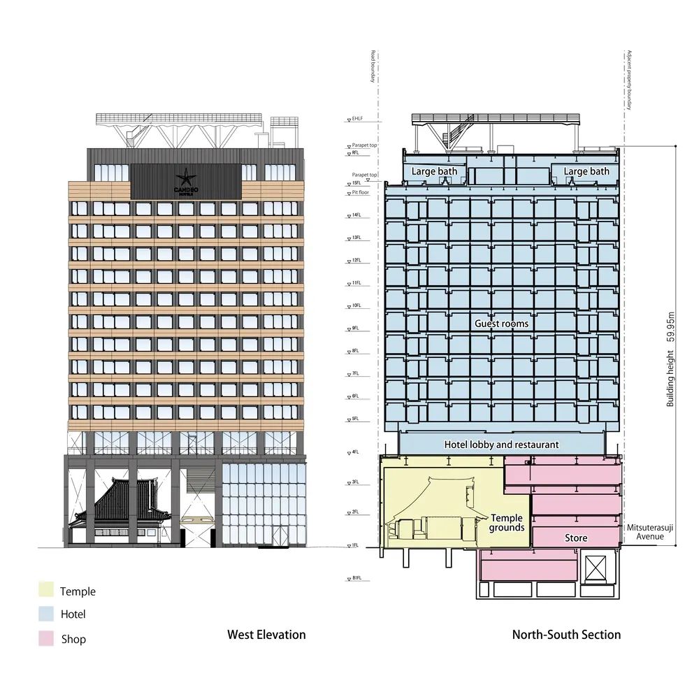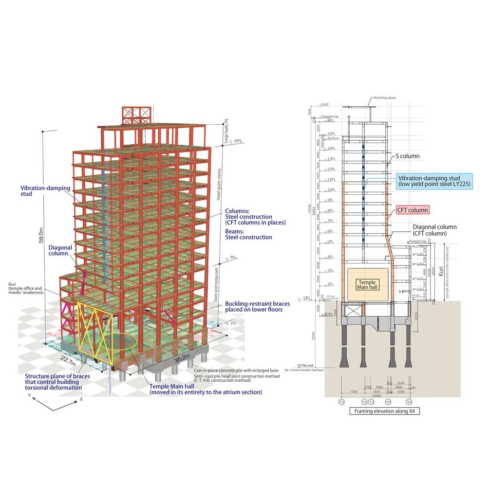 大廈共設地上14層、地下1層,核心構成包括:設置于三層中庭空間的密寺本堂,中高層酒店區域,以及底層的街道型商業界面。本堂建筑通過三階段整體平移工程從原址遷入,并與大樓主體結構間設置120至200毫米的獨立縫隙,用于確保地震反應時的結構分離,降低相互影響風險。