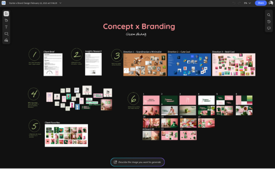 Firefly Boards的核心優(yōu)勢(shì)在于無(wú)縫銜接創(chuàng)意構(gòu)思與執(zhí)行落地。在最近一個(gè)咖啡店品牌項(xiàng)目中,Akda?從清晰的客戶需求出發(fā),通過(guò)深度調(diào)研確定品牌基調(diào),繼而運(yùn)用該工具探索多元設(shè)計(jì)方案。