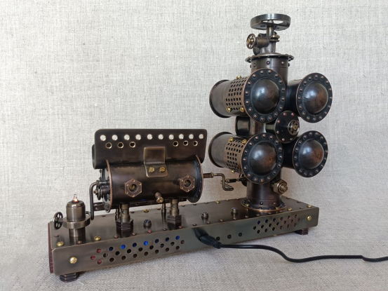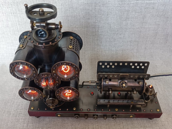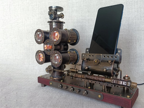 手工打造的Nixie Tube復古時鐘,黃銅與銅材質重現維多利亞時代風韻。七色LED顯示支持12/24小時制,側面巧妙集成手機支架,是傳統工藝與現代功能的絕妙融合。