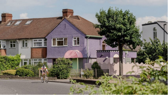 以大膽用色聞名的Office S&M工作室,在倫敦南部Lewisham街角改造了這棟1950年代風格的中世紀住宅。薰衣草質感墻面、青檸色排水管與棋盤格裝飾帶,使其在灰褐色聯排住宅中格外醒目。