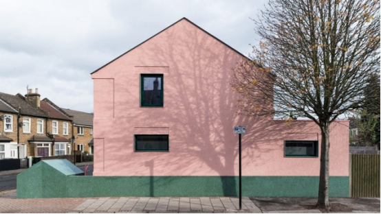同工作室打造的這棟倫敦粉綠相間住宅,以斑點紋理墻面與水磨石細節,在紅磚建筑群中脫穎而出。特殊角度的地塊規劃,確保室內能獲得雙向采光與視野。