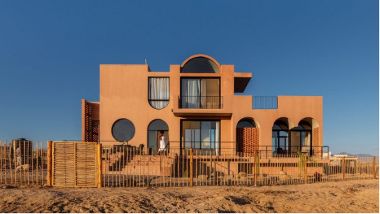這座陶土橙色的度假別墅位于南下加州Todas Santos海灘,拱形開口與磚砌格柵構成"單體雕塑"般的視覺效果。