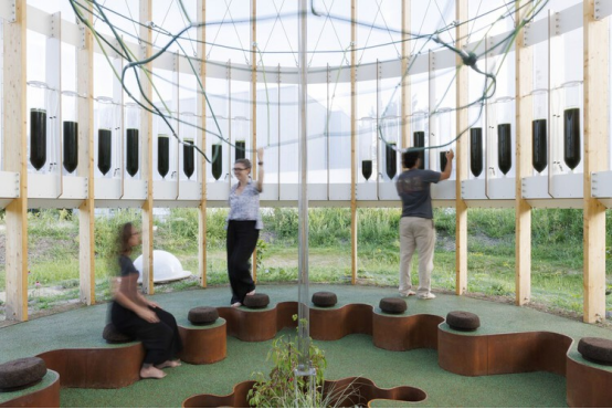 當人工智能主導智慧建筑討論時,非人類生物智能的平行發展正在興起。研究人員發現細菌、真菌、藻類等生物經過數百萬年進化形成的非凡智慧。生態邏輯工作室的H.O.R.T.U.S.(城市刺激響應水生有機體)系列作品,將藍藻細菌整合到建筑環境中,形成能吸收排放物并產生生物質的光合作用系統。東京森美術館展出的"光合塔"項目,讓細菌、自動化農作設備與動物智能成為與人類共生的"生物公民"。