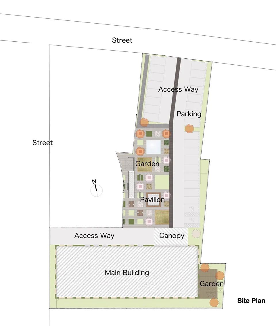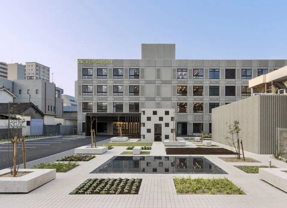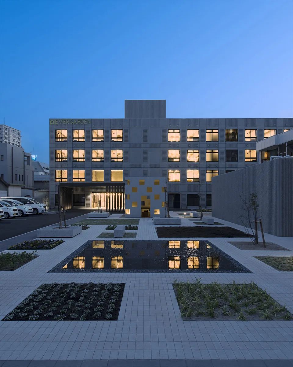 雖然養老生活設施往往建在郊區,為老人提供更安靜的環境,同時降低土地成本。這座養老生活設施位于市區,處于久留米站的中心地帶,從久留米站步行只需 6 分鐘,公共交通和醫療服務四通八達。便利的地理位置也為家人探訪提供了方便、設計也強調了與當地社區的聯系,并不是一味地切斷老人與城市的關系。
