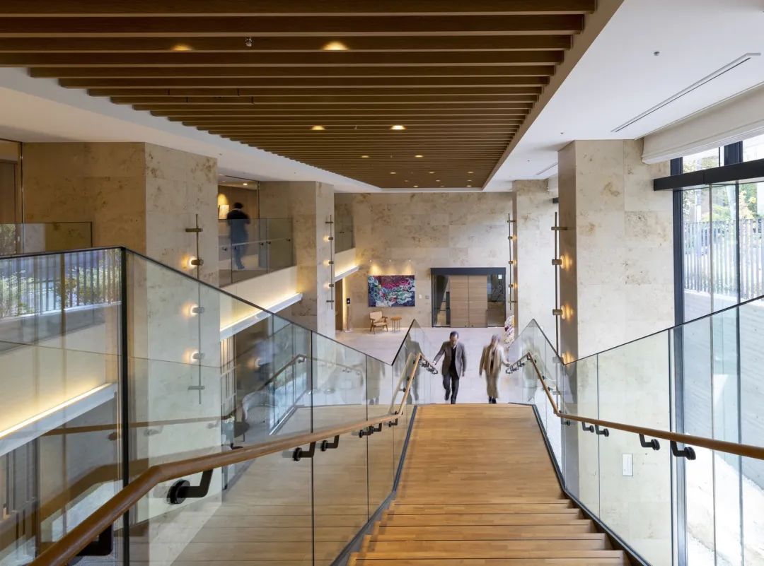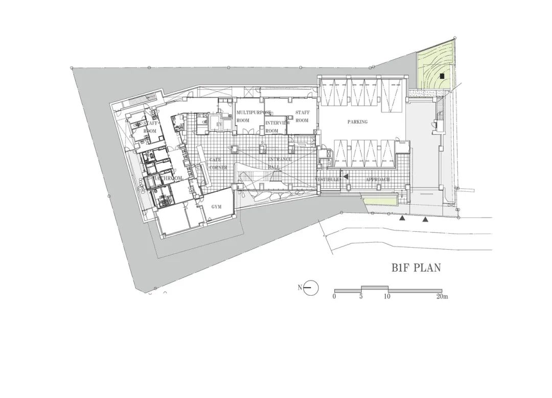 面對極具挑戰性的陡坡,該設計巧妙地安排了人員和車輛的出入口,同時最大限度地增加了樓層數。建筑的主入口位于斜坡底部,擁有一個宏偉的兩層玻璃墻入口大廳,與一個引人注目的三層頂部采光中庭相連。這使得地下空間光線充足,打破了其地下空間的性質。外部樓層和內部樓層的巧妙結合,為所有空間帶來了非凡的開放感和連續性,創造了一個流暢的空間之旅。