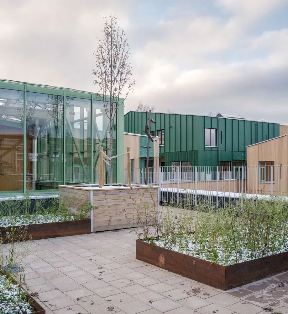 綠色屋頂花園、感官庭院和鄉村街道–綠色和感官戶外環境已成為 Furuset Hageby 的標志。其主要設計特點是由一系列建筑組成三個相互交織的庭院,這些庭院平緩地坐落在景觀中,適應了地形高度的變化,并為貫穿整個村莊的室外綠地提供了空間。環形屋頂花園為癡呆癥患者創造了一個舒適的連續性,確保他們總能安全地回到起點。屋頂花園內有大量植被、香草園、溫室和休息區。