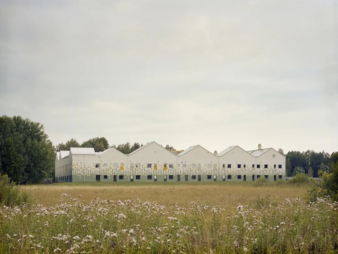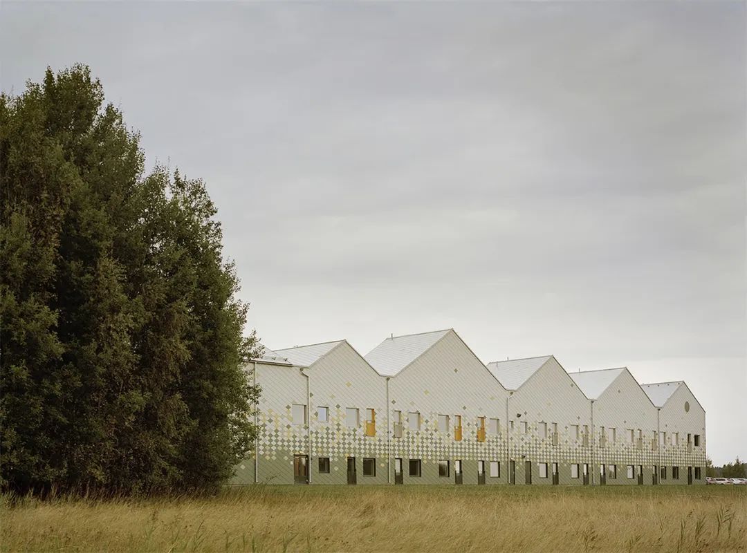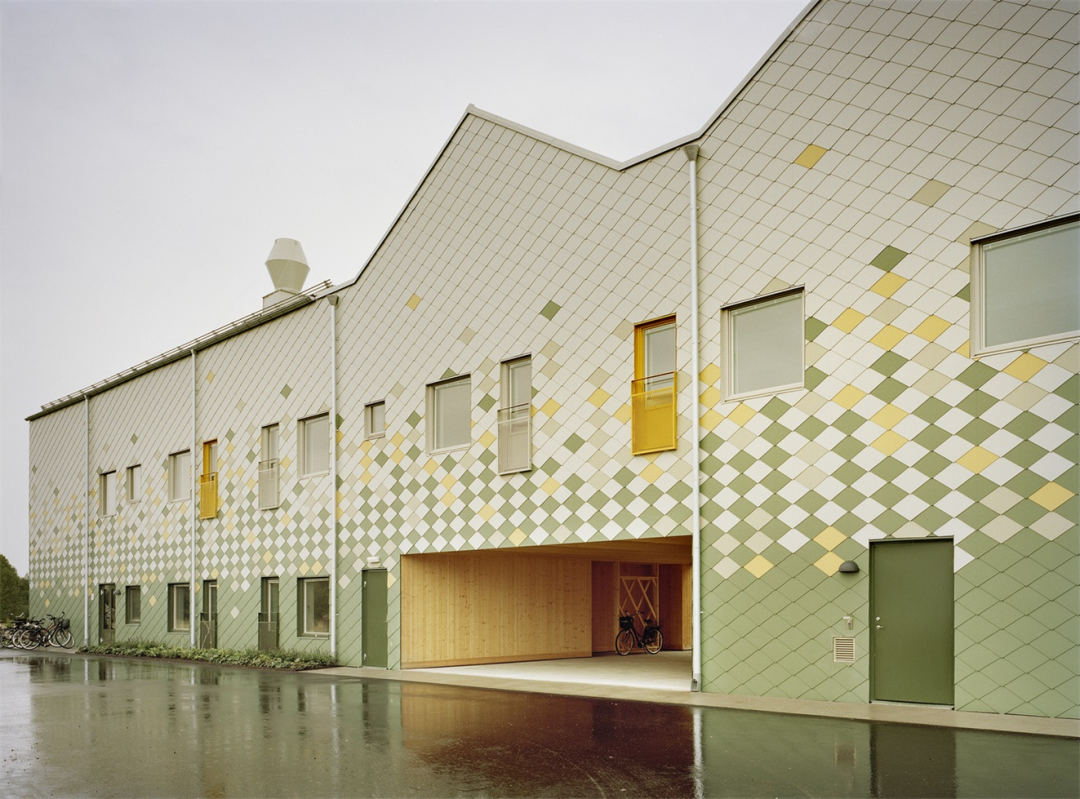 建筑物的外部面向當地大規模的工業建筑、森林和農業景觀,并覆蓋有纖維水泥圖案。該圖案具有不同的顏色和色調,與周圍綠色田野的明亮色調相對應。外墻的表達方式類似于紡織業的十字繡邊框,環繞著建筑。