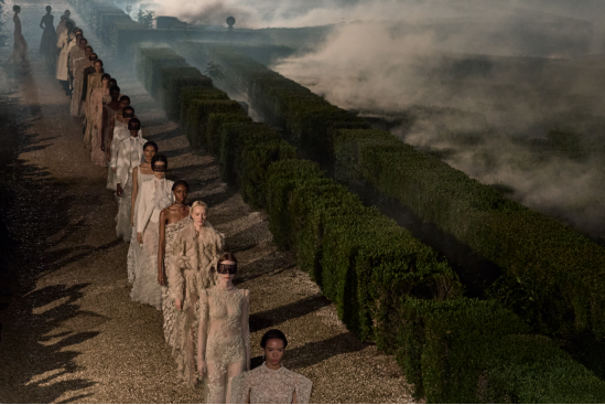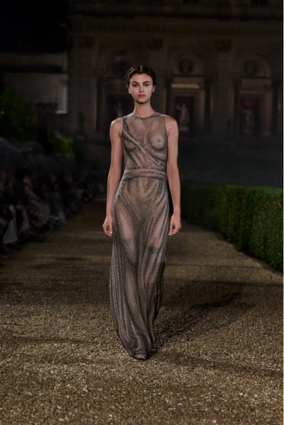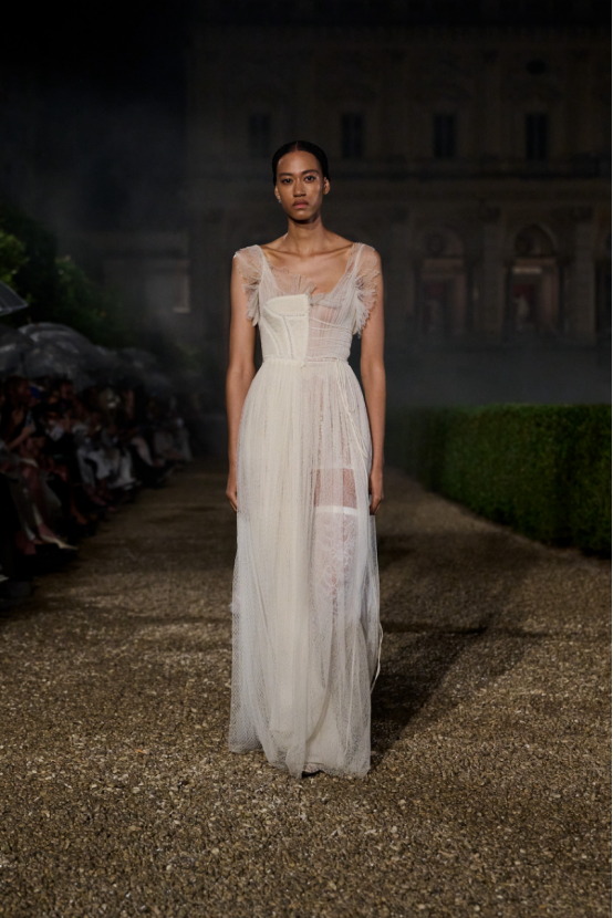 對意大利設計師蔻麗而言,這場在故鄉羅馬舉辦的大秀堪稱回歸之旅。選址18世紀巴洛克風格別墅的花園,賓客們被要求身著白色(女士)或黑色(男士)禮服出席,驟降的陣雨更添戲劇氛圍。設計師以"美麗的混亂"(La bella confusione)為靈感——這個曾被意大利編劇提議作為費里尼《八部半》片名的概念,融匯了文藝復興裙裝、古典雕塑、電影城黃金時代的華美與梵蒂岡教廷圣袍(深紅色天鵝絨兜帽長袍等)。蔻麗稱系列如夢似幻的質感如同"白日夢"與"魔幻現實主義":暮色中,模特宛如游走于雨霧花園的幽靈,以獨特方式"重構羅馬的人物、景觀與神話"。
