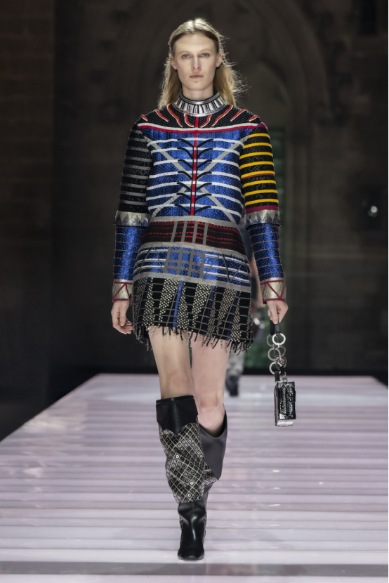蓋斯奇埃爾將阿維尼翁稱為"文化搖籃",在哥特式教皇宮的中庭,英國舞臺設計師埃斯·德夫林(Es Devlin)打造了震撼布景:空劇場座椅如階梯攀升,模特從中蜿蜒而下,賓客則坐在教堂長椅般的座位上。系列聚焦"服裝的表演性、藝術價值與敘事力量",中世紀元素被賦予未來主義詮釋:鑲羊皮邊的錦緞夾克、羊腿袖、蓬松襯衫與褶皺。最驚艷的是材質實驗:綴滿礦物感寶石的露趾短靴、銀鏈編織的襯衫,以及呼應宮殿壁畫的提花織物。