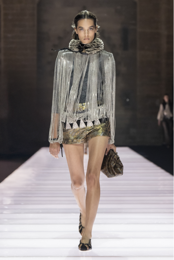 在創意總監空缺期(新任總監Demna將于年底上任),古馳仍如期在品牌誕生地佛羅倫薩發布早春系列。15世紀的塞蒂曼尼宮(Palazzo Settimanni)——古馳1953年購入的皮具工坊,現為品牌檔案館——成為"古馳即佛羅倫薩"主題的完美舞臺。設計團隊復刻了品牌絲巾的復古圖案,慶祝誕生50周年的雙G標識閃耀于絲襪;艷色人造毛皮呼應年初米蘭秋冬系列的張揚,搭配飛行員墨鏡、蕾絲連體衣與寬肩蝴蝶結連衣裙。終場時,模特走入佛羅倫薩的暮色,象征"品牌回歸城市,開啟新旅程"。